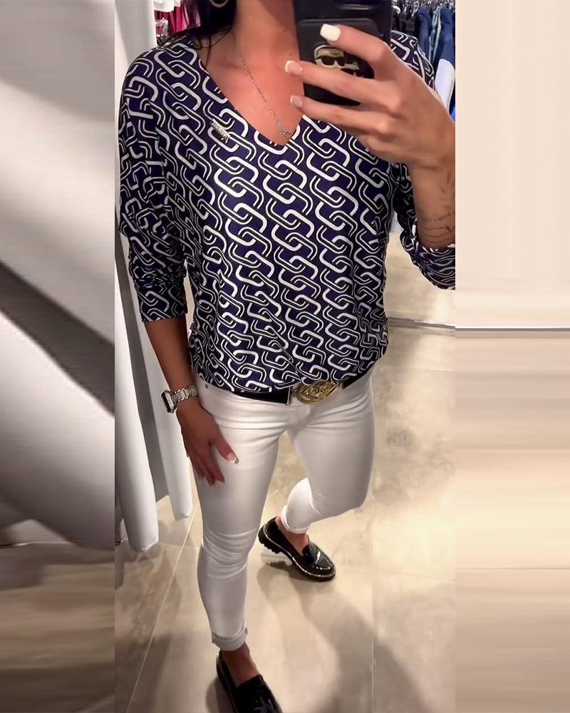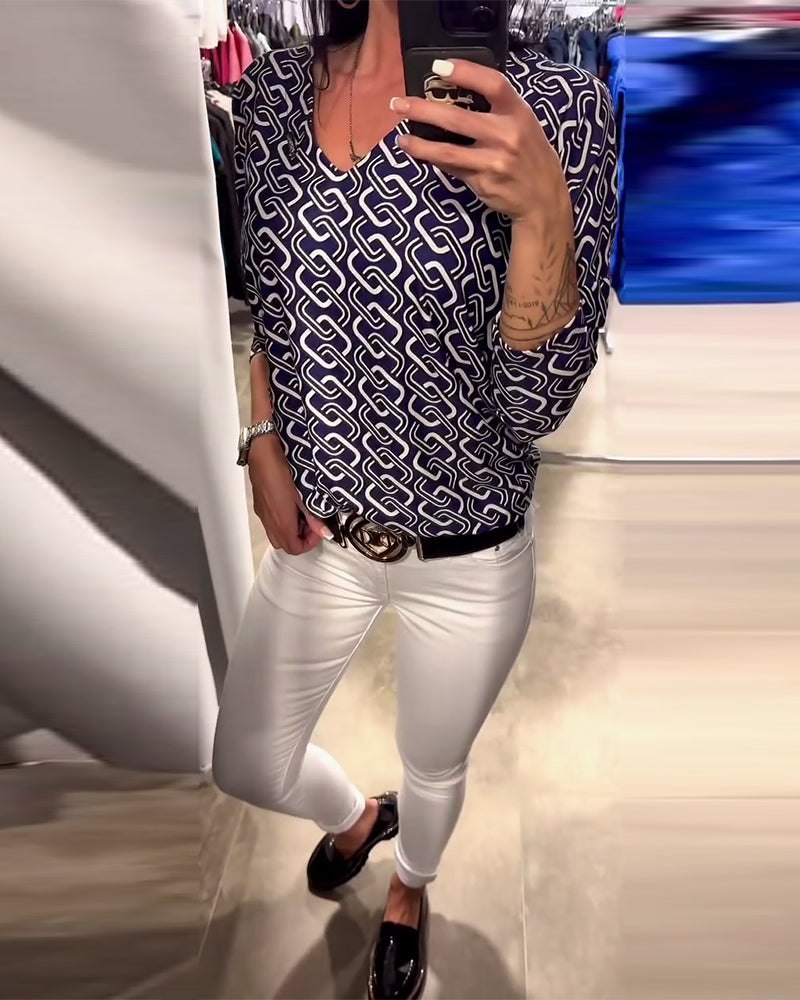 V-Neck Long Sleeve Top with Chain Print